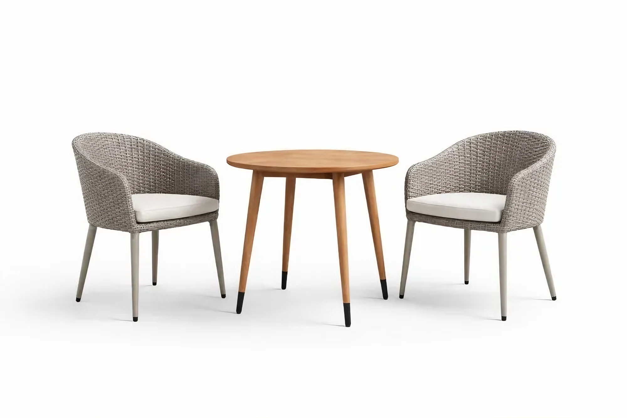 Outdoor Patio Set with Round Wooden Table and Two Wicker Chairs