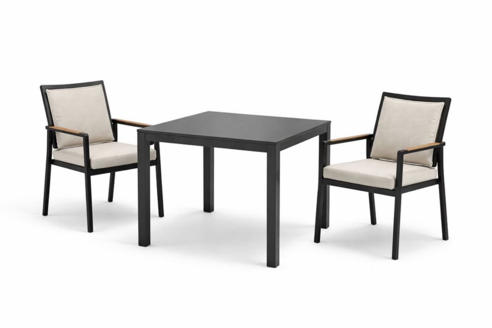 Metal Outdoor Dining Set with Square Table and 2 Armchairs Black Frame Beige Cushions