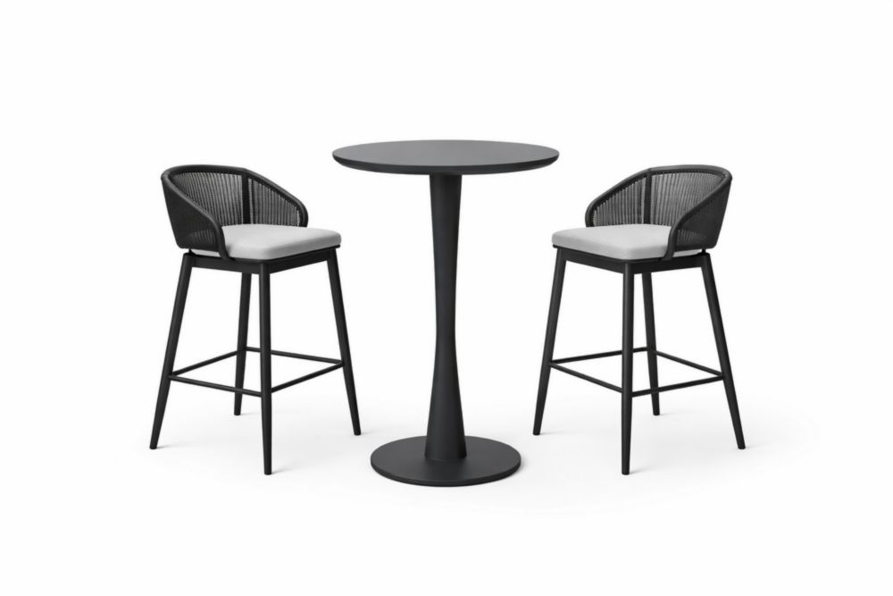 Black Metal Outdoor Bistro Set with Woven Rope Chairs and Cushions