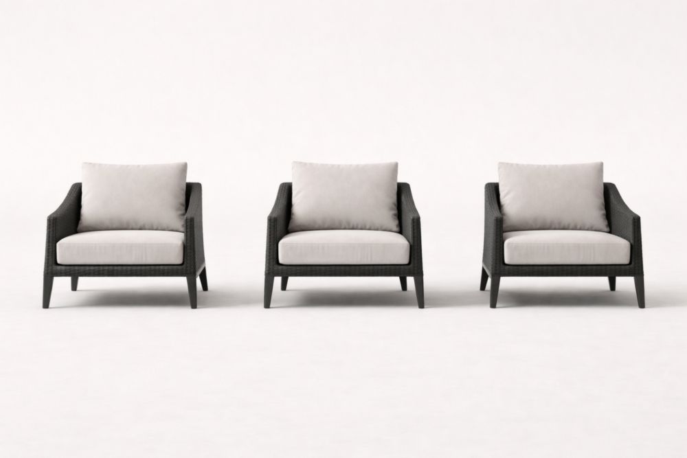 Material: Powder-coated aluminum frame with synthetic rattan, cushions made of weather-resistant polyester fabric.